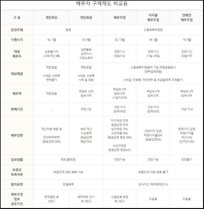 | 구분 | 공적채무조정 (법원-개인회생. 파산) | 사적채무조정 (신용회복위원회) |