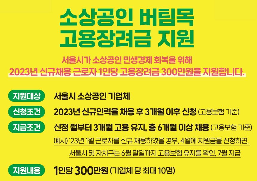 서울시가 소상공인 민생경제 회복을 위해 2023년 신규채용 근로자 1인당 고용장려금 300만원을 지원합니다.