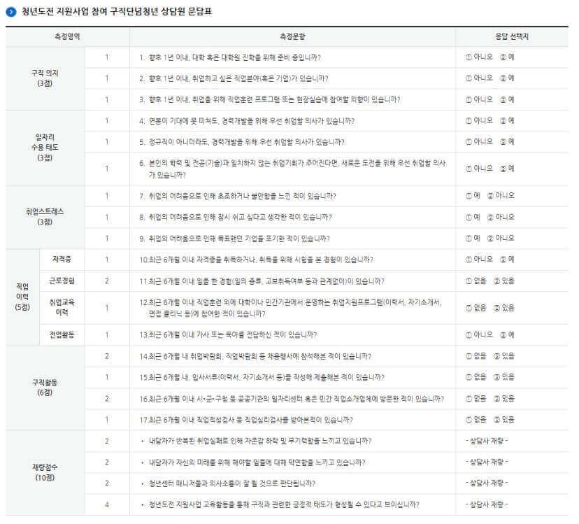 - 구직단념청년 문답표(서식16) 21점 이상 (만점 30점)인 청년
