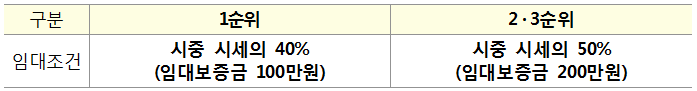 | 임대조건 | • 시중 시세 40∼50% 수준의 임대료 및 임대보증금으로 입주 순위에 따라 차등 • 공급대상 주택별 임대조건은 첨부 “주택내역” 참조 |