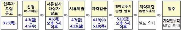 | 계약체결 | 개별 안내 | • 예비입주자 순번 발표 후 선택 가능한 주택 및 주택열람에 관한 계약체결 안내문을 순차적으로 발송할 예정입니다. • 예비입주자 순번(주택을 지정할 수 있는 순번) 발표 후 해당 동(건물)의 공급가능한 주택을 개방하고 순번에 따라 희망하는 주택을 지정하여 계약체결하는 방식으로 진행됩니다. * 단, 지역본부(주거지원종합센터) 사정에 따라 주택 개방이 불가할 수 있습니다. • 입주는 계약체결일로터 60일 이내에 완료하여야 합니다. |